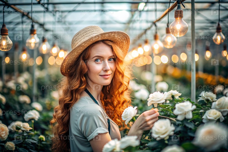 Портрет красивого садовника с рыжими волосами в соломенной шляпе, работающего с розами в стеклянной теплице