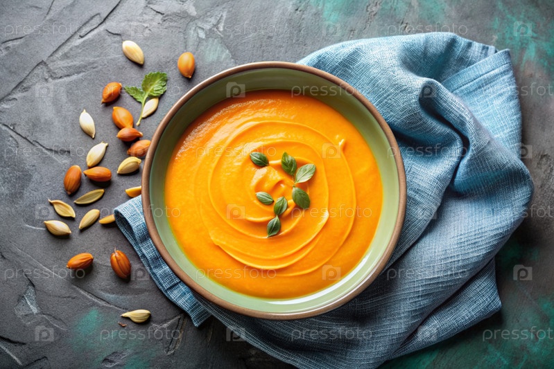Традиционный мягкий тыквенный кремовый суп с сливками и семьями тыквы на бирюзовом бетонном фоне