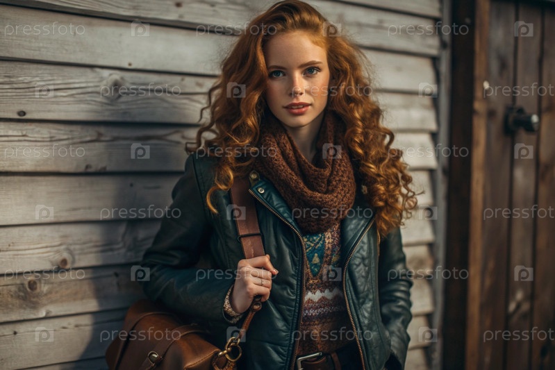 Осенний портрет. Близкий план молодой рыжеволосой женщины с выразительными зелеными глазами в коричневом кожаном куртке и бирюзовом шарфе