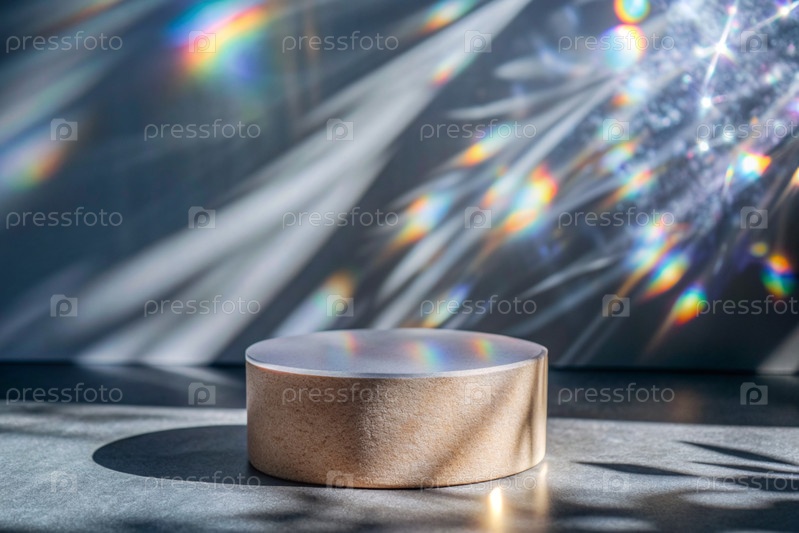 Пустой цилиндрический подиум со сверкающими кристаллами при преломлении света на минималистическом фоне, стенд для демонстрации моделей косметики и товаров