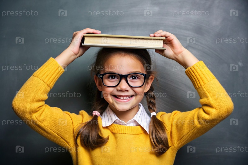 Красивая девушка с очками и книгами на голове. Ребенок впервые идет в школу. Ребёнок в классе со доской на заднем плане. Возвращение к школе