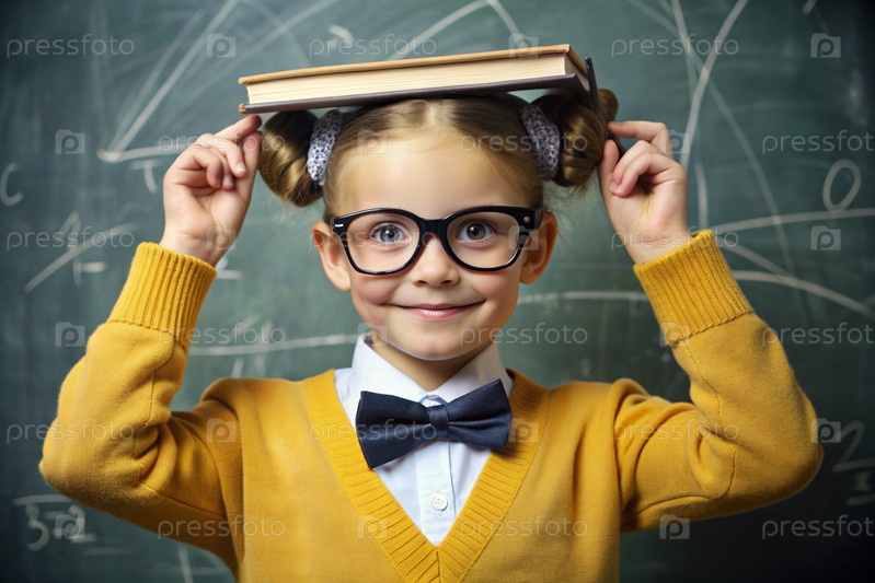 Красивая девушка с очками и книгами на голове. Ребенок впервые идет в школу. Ребёнок в классе со доской на заднем плане. Возвращение к школе