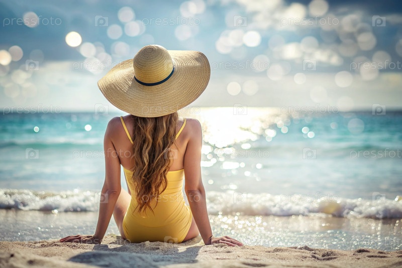 Женщина на отдыхе, сидящая в купальнике и соломенной шляпе с широкими краями на пляже в солнечный день и смотрящая на море