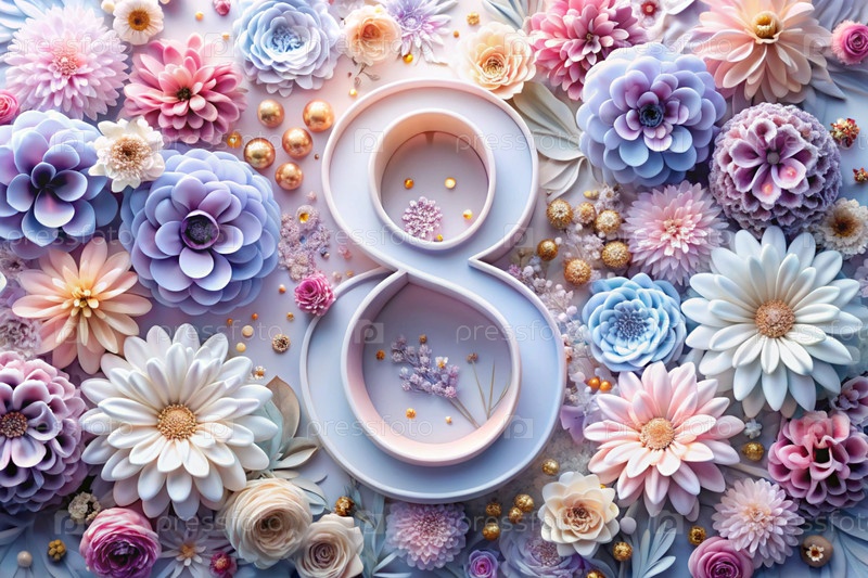 Международный женский день. Баннер, флаер. Праздничный, нежный цветочный фон в голубых и розовых тонах с номером 8