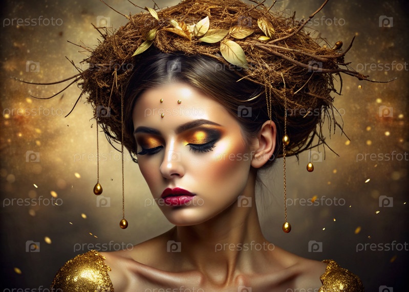 Творческий баннер для салона красоты в черно-золотых тонах. Профессиональный макияжный художник, стилист и парикмахер. Красивая женщина с вечерним гримом и золотым гнездом и яйцами на голове. Индустрия красоты