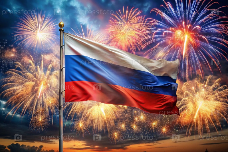 Россия. Москва. Национальный флаг Российской Федерации на фоне фейерверков. Русский триколор. День России отмечается 12 июня