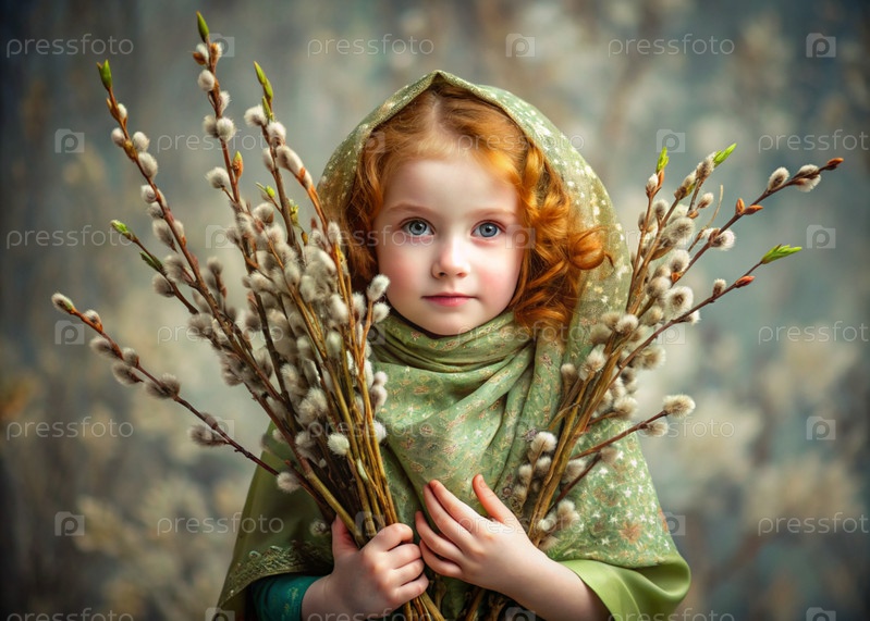 Пальмовое воскресенье. христианство. портрет трехлетней девочки в русском народном шале с ветвями ивы в руках на фоне цветущей ивы