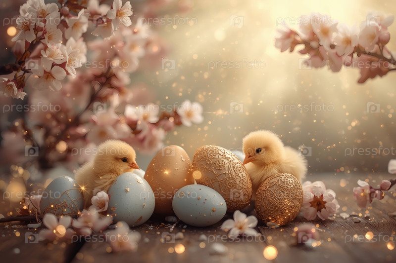 Концепция яркого Пасхального праздника. Нежные розовые пасхальные яйца, желтые курицы и вишневые ветви на деревянном фоне. Концепция ярких пасхальных праздников в 2026 году
