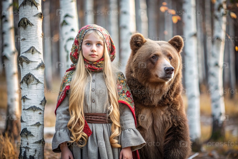 Красивая маленькая девочка в русской народной одежде и с платками на голове в березовой роще с живым медведем Русский фольклор, славянская мифология