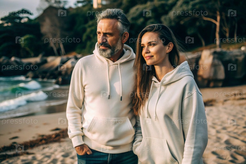 Красивая молодая женщина и мужчина в белых капюшонах на пляже. макеты шаблонов для дизайна капюшона, печатная площадка для логотипа или дизайна