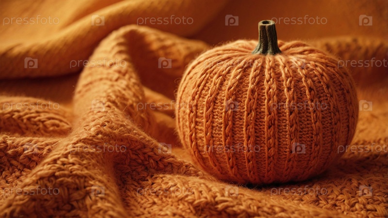 Красивый осенний фон. Хэллоуин, День благодарения. Оранжевая вязаная тыква на фоне оранжевого волокна