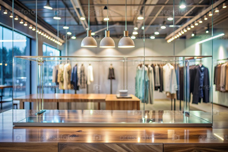 Минимальный фон для демонстрации продукта.Современный стеклянный подиум со стеклянной стеной в современном магазине одежды.Элегантный дизайн для презентации продукции