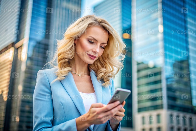 Блондинка-бизнесменка с кудрявыми волосами, она одета в обычное голубое пиджак. В руках у нее смартфон. Бизнесмен смотрит на свой мобильный телефон