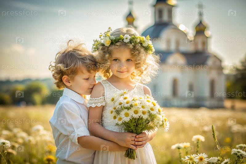 Всероссийский день семьи, любви, верности. милый мальчик и девочка с букетом ромашек на фоне православной церкви. День святого Валентина Петра и Февронии. религия, христианство