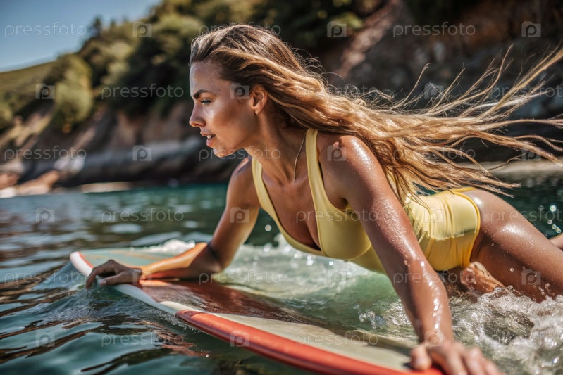 Женщина на доске для серфинга в купальнике в океане в солнечный день