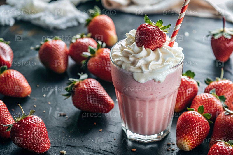 Освежающий клубниковый молочный коктейль с битой сливкой и соломой на столе, окруженном свежими ягодами