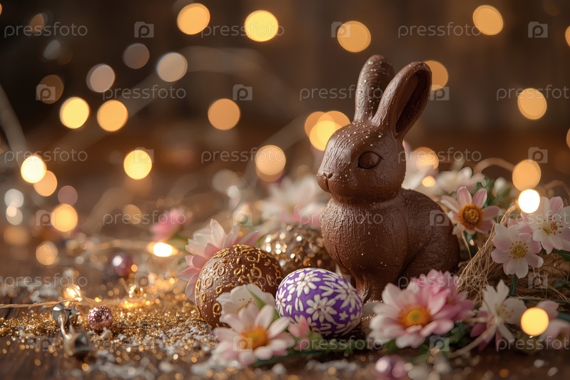 Шоколадное пасхальное яйцо, шоколадный кролик и весенние цветы на деревянном фоне. Пасхальные сладости и лакомства. Концепция яркого праздника Пасхи в 2026 году. Хорошая открытка