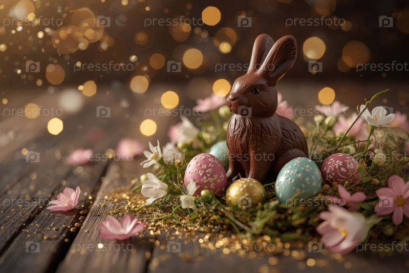 Шоколадное пасхальное яйцо, шоколадный кролик и весенние цветы на деревянном фоне. Пасхальные сладости и лакомства. Концепция яркого праздника Пасхи в 2026 году. Хорошая открытка