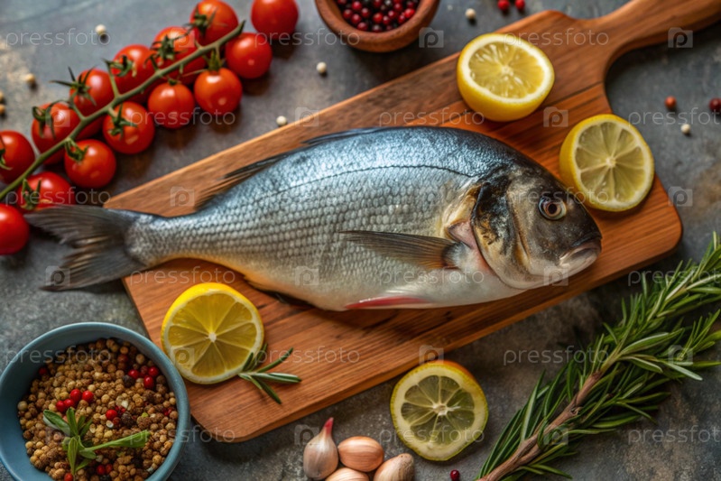 Вкусная и здоровая рыба. сырой дорадо с лимоном и ингредиентами на темном фоне. баннер, меню, место для текста рецепта, верхний вид