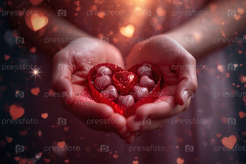 Руки женщины с подарком в форме сердца с шоколадом на День святого Валентина