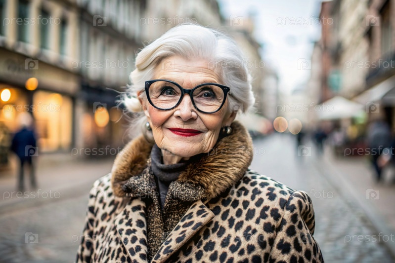 Портрет стильной, модной пожилой женщины, пенсионерки 70 лет на улице города в очках и одежде леопарда
