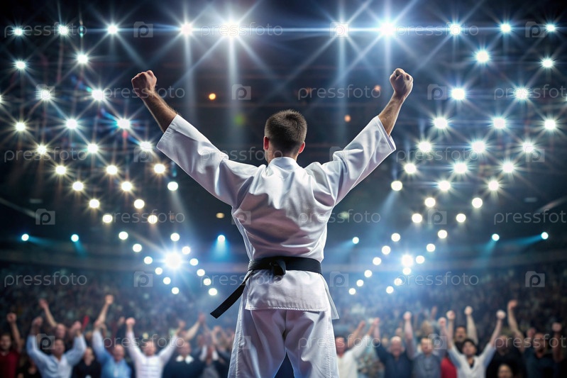 Спортсмен по каратэ с гордостью поднимает руки на стадионе в свете фонарей и прожекторов после того, как стал олимпийским чемпионом