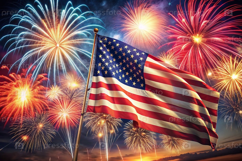 Флаг США с фейерверком в небе День независимости - 4 июля под открытым небом