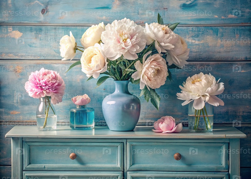 Красивые бело-розовые пионы в стеклянных вазах и бутылки на деревянном шкафчике. Цветы и почки в вазе. Светлый, белый, розовый и синий цветочный фон