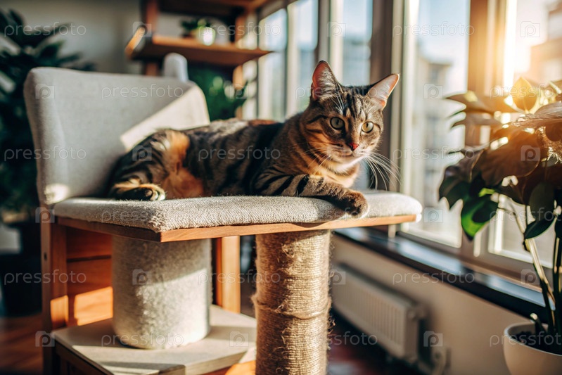 Животные.Кошка внутри дома на царапинованном столбе в солнечный день.Откормить кошку от разрыва мебели и обоев.Уход за домашними животными