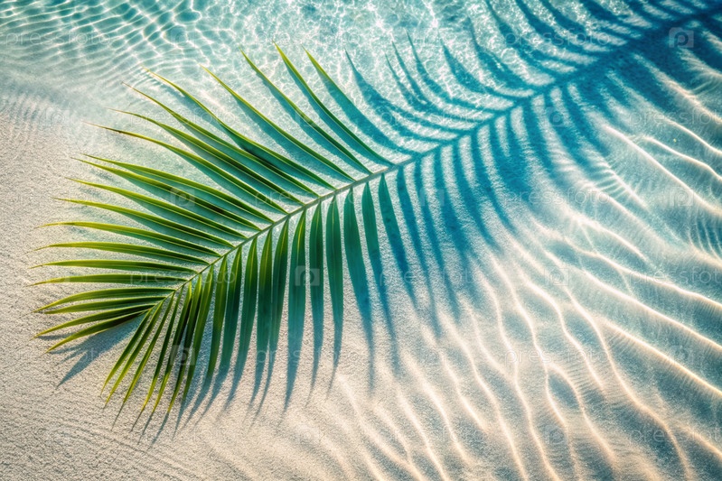 Концепция летнего отдыха на пляже. Вид тропических листьев на поверхности воды. Тень пальмовых листьев на белом песчаном пляже. Красивый абстрактный фон для баннера