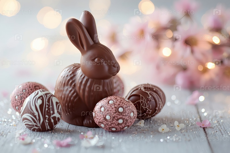 Шоколадное пасхальное яйцо, шоколадный кролик и весенние цветы на деревянном фоне. Пасхальные сладости и лакомства. Концепция яркого праздника Пасхи в 2026 году. Хорошая открытка