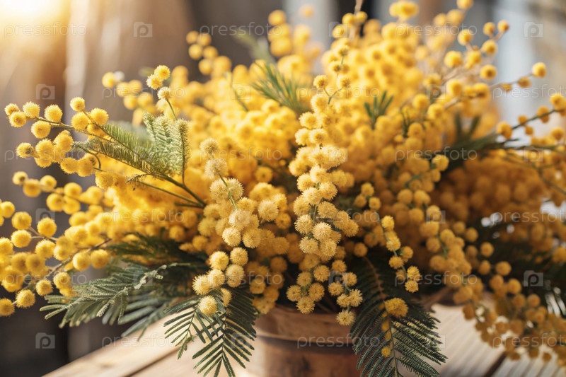 Красивый пушистый букет мимозы в вазе. Близко. Концепция домашней весны и Международный женский день 8 марта