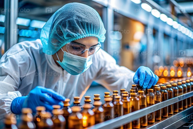 Производство лекарств: фармацевт тестирует медицинские флаконы на автоматическом трубопроводе фармацевтической производственной линии с использованием искусственного интеллекта