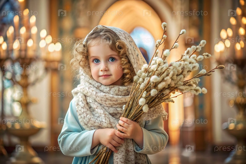 Пальмовое воскресенье. христианство. портрет трехлетней девочки в русском народном шале с ветвями ивы в руках на фоне православной церкви