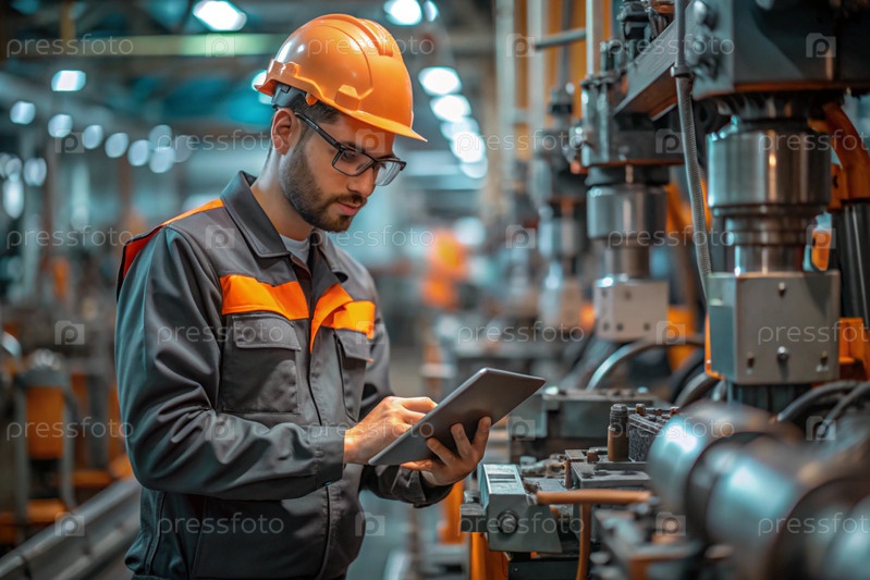 Профессиональный инженер, рабочий, техник в шлеме проверяет и работает на машине на заводе по производству запчастей