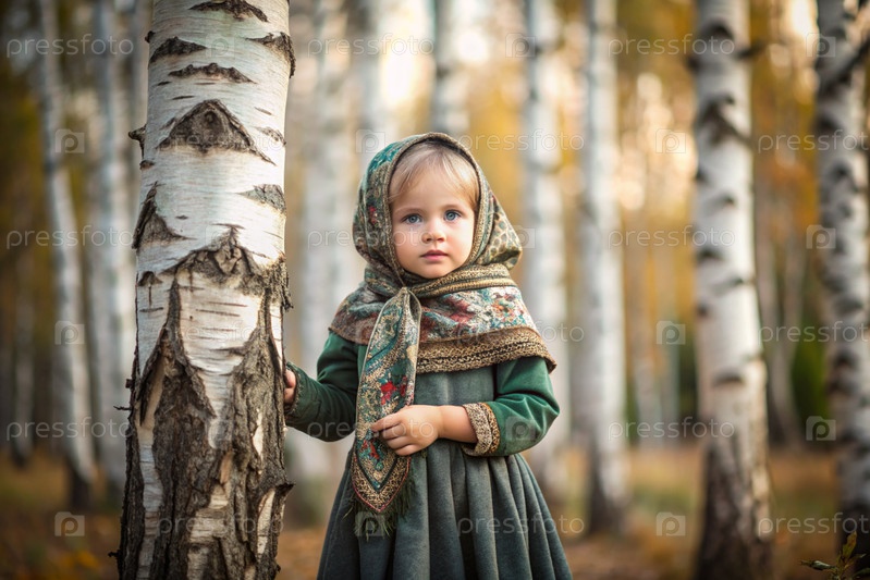 Русские народные традиции.Русский аромат.Красивая девочка в национальном русском платье и шаль в прекрасном березовом роще осенью.Портрет красивой девушки в березном лесу
