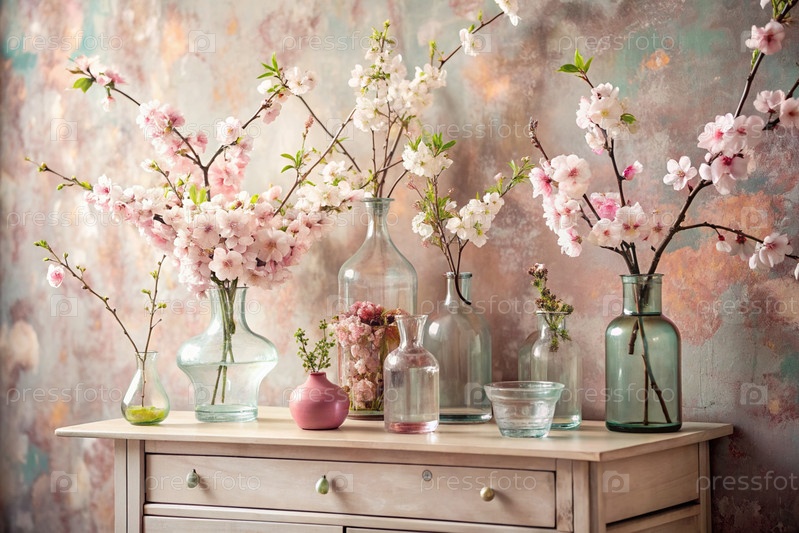 Красивая ветвь розовой вишни в стеклянной вазе и флаконы на древнем деревянном шкафу. Букет цветов в вазе во внутренней части дома. Светлый, бежевый, розовый цветочный фон