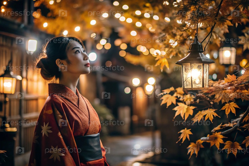 Японская девушка в традиционном национальном костюме - кимоно. На сказочном фоне фонарики и осенние деревья. Портрет символизирует традиции и культуру народа Японии