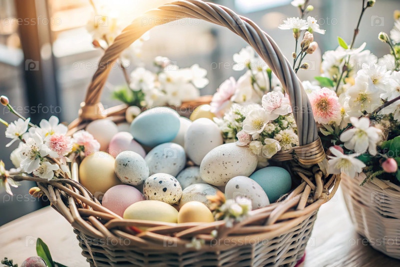 Пасхальные яйца и весенние пасхальные цветы в плетеновой корзине, концепция праздника Пасхи