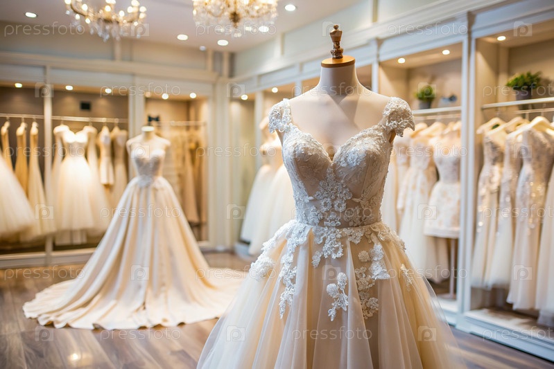 Аренда и покупка свадебных платьев для мероприятий. Близкие. Элегантное белое свадебное платье на манеке в роскошном брачном салоне