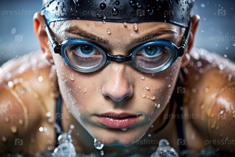 Спортивное плавание. Женское плавание. Спортсменка, которая носит очки для плавания в бассейне во время соревнований на близком расстоянии. Женщина смотрит прямо в камеру
