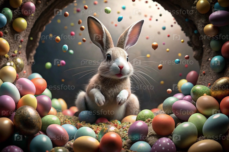 Известный праздник. милый пасхальный кролик заглядывает из ямы с красочными яйцами вокруг. концепция счастливой Пасхи