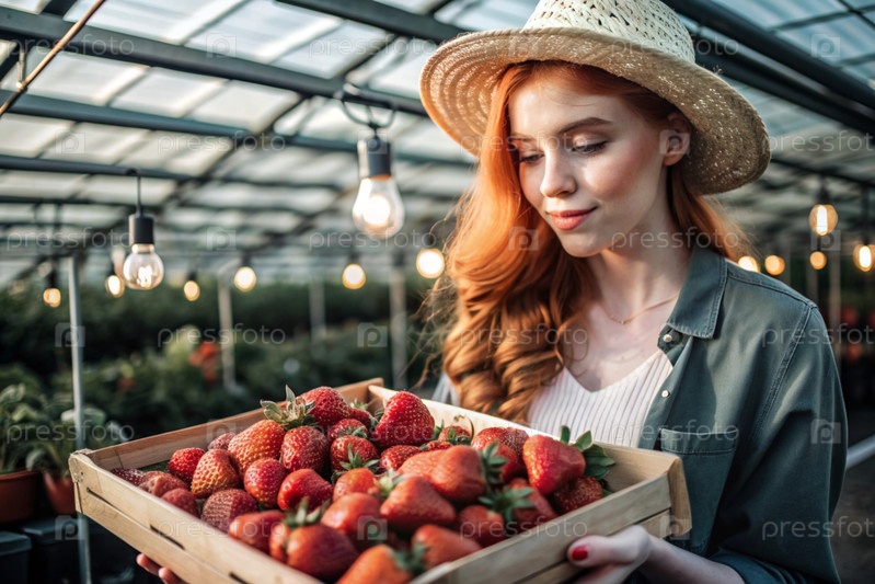 Сельскохозяйственная промышленность. стильный садовник в шляпе собирает богатый урожай клубники в теплице. деревянный ящик со земляницами в руках фермерской девушки