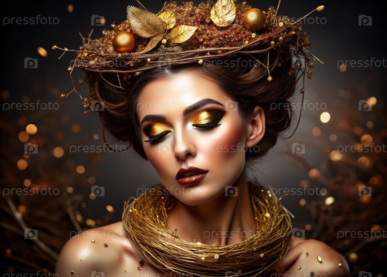 Творческий баннер для салона красоты в черно-золотых тонах. Профессиональный макияжный художник, стилист и парикмахер. Красивая женщина с вечерним гримом и золотым гнездом и яйцами на голове. Индустрия красоты