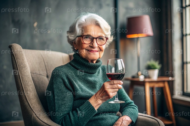 Современная, стильная пожилая женщина с короткими волосами со стаканом красного вина на стуле в гостиной дома