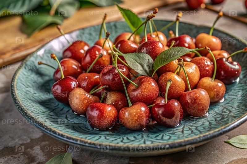 Сладкие ягоды и фрукты ярко-красного и желтого цвета с каплями воды. Вегетарианство. Здоровое питание. Свежие плоды на столе