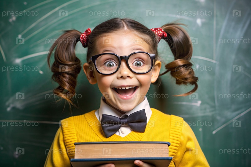 Красивая девушка с очками и книгами. Ребенок впервые ходит в школу. Ребёнок в классе с доской на заднем плане. Возвращение к школе