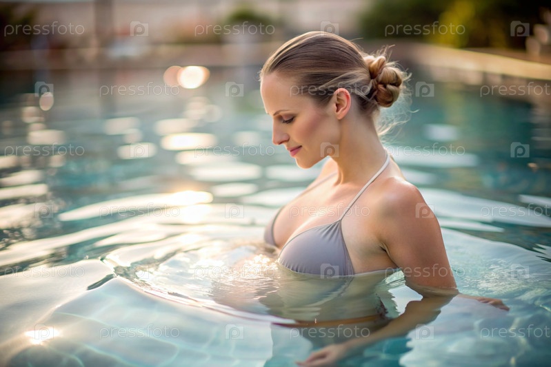 Расслабление, душевное спокойствие. Беременная красивая женщина в отопительном бассейне на открытом воздухе. Понятие беременности, родов и родительства. Здоровый образ жизни
