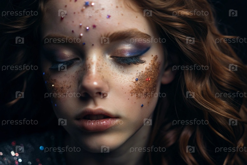 Покрытие лица девушки праздничным макияжем и ленточками.Изображение придает ей сказочный и мистический вид.Концепция новогодней ночи или дня рождения