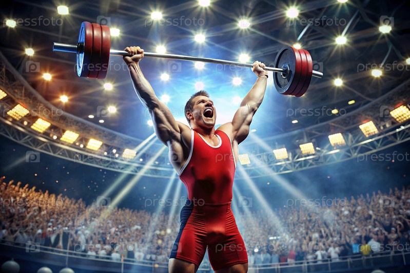 Соревнования по тяжелой атлетике. Спортсмен берет на себя большой вес штанги. Спорты летних Олимпийских игр